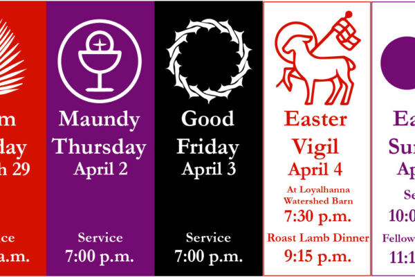 Holy Week 2026 All are welcome to our annual celebration of Jesus’s death and resurrection, spread out across the week of March 29 to April 5 Be sure to join us Saturday night for The Great Easter Vigil, a worship gathering that combines ancient prayers of the church with contemporary music and a roast lamb dinner.